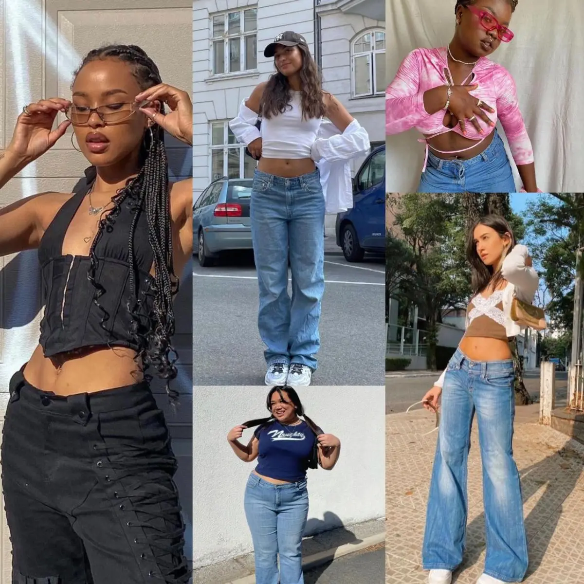 Os jeans de cintura baixa foram um dos estilos mais populares na década de 2000, com muitas mulheres adotando o visual de cintura baixa. Esses jeans eram projetados para serem usados abaixo do umbigo, expondo uma parte da barriga. Eles eram frequentemente usados com camisetas curtas e tops de culturas.